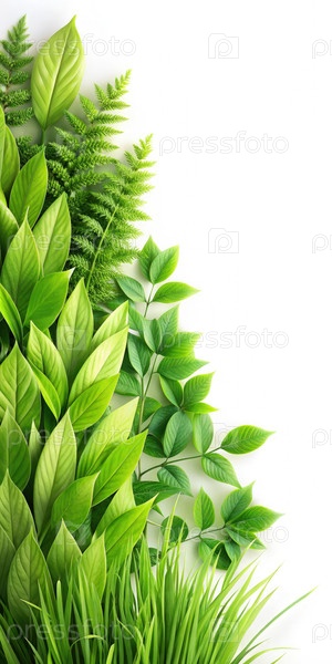 Ясные зеленые листья и трава расположены на белом фоне