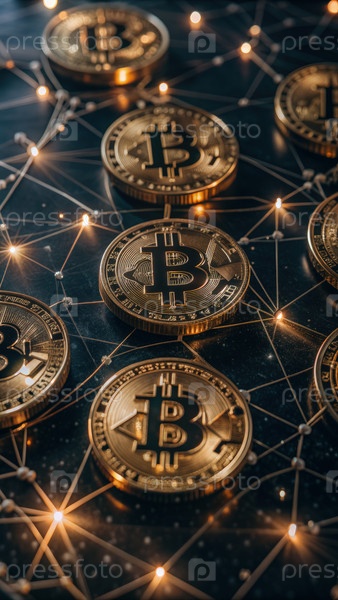 Связанные между собой светящиеся логотипы Bitcoin на темном фоне