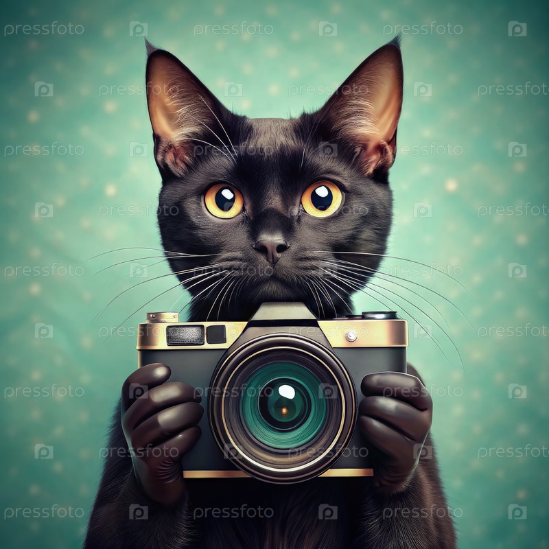 Фотограф черной кошки держит в руках старую камеру
