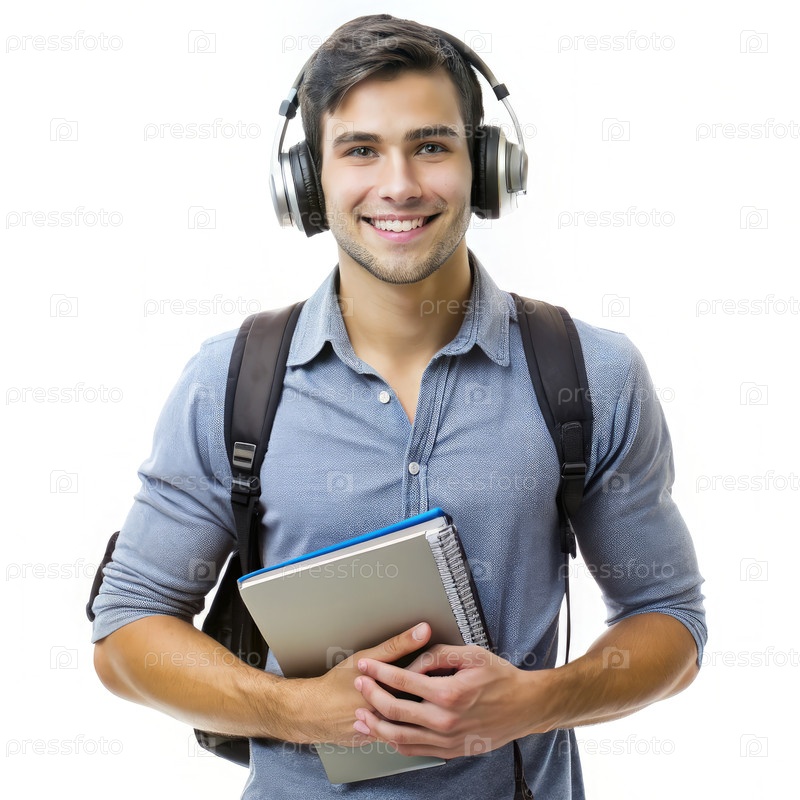Улыбающийся студент колледжа, носящий наушники и несущий книги
