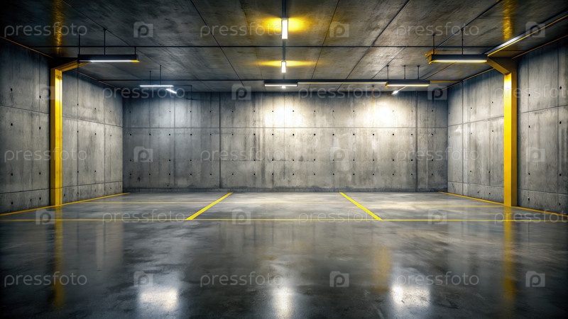 Пустой подземный парковочный гараж с желтыми линиями. генеративная ИИ