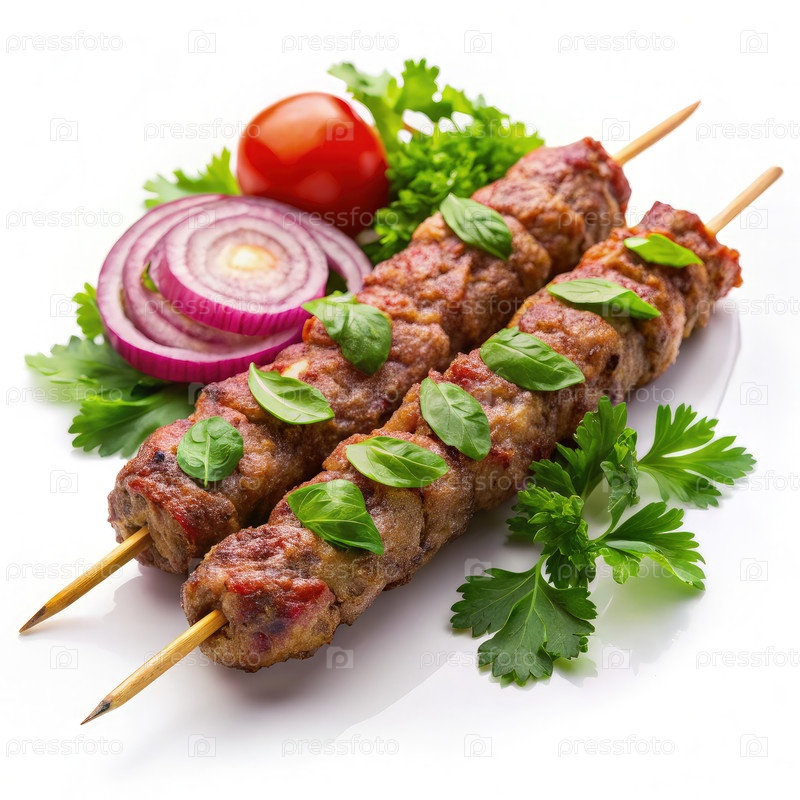 Два жареного говяжьего кабоба с базиликом, помидором и луком