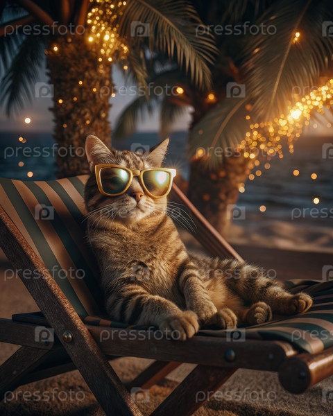 Сирень-кошка отдыхает на пляжном кресле при закате солнца