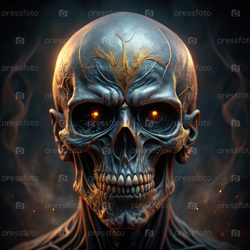 Реалистичная иллюстрация металлического черепа с светящимися глазами на темном фоне