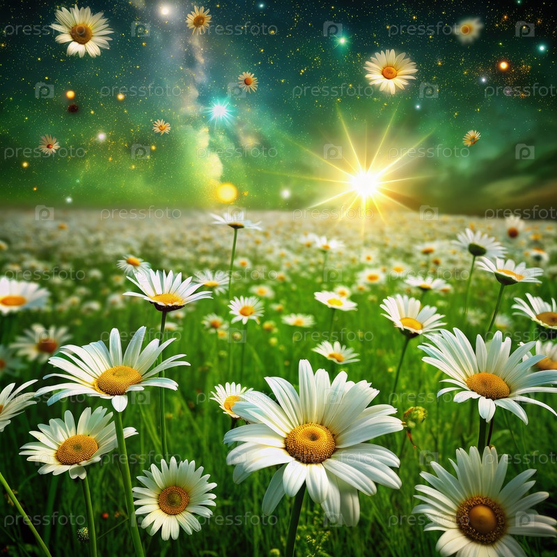 Солнечный день в поле ромашек с звездным небом