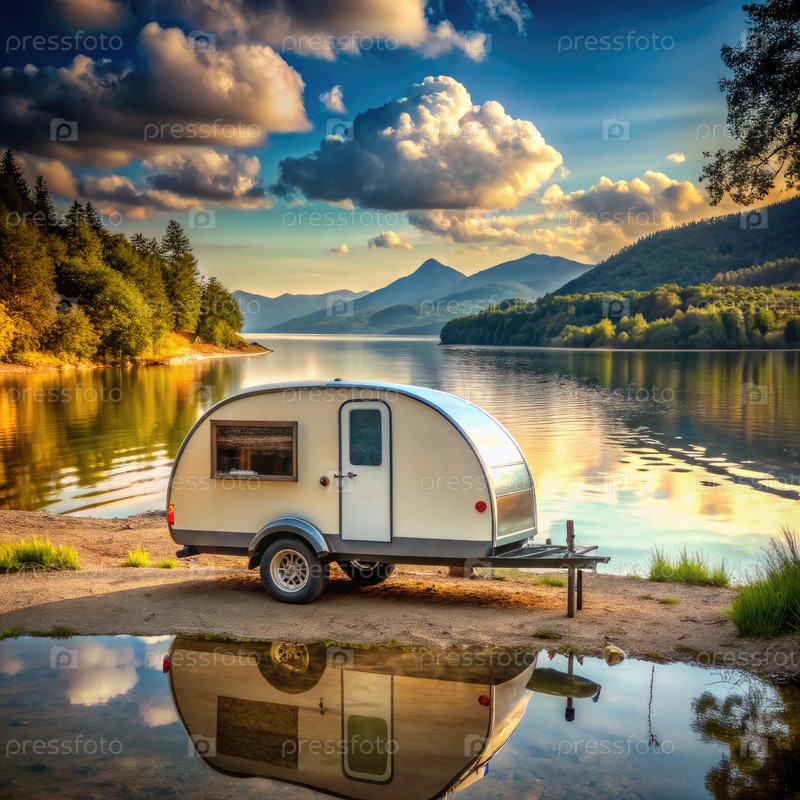 Слезотопительный трейлер, припаркованный у горного озера на закате