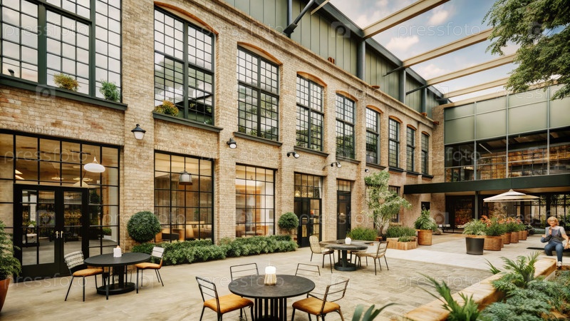 Историческое кирпичное здание реконструкция двора с наружными сиденьями. генератив AI