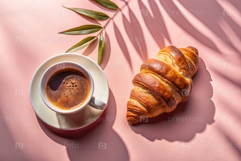 Чашка кофе и кроассан на розовой поверхности с солнечным светом и тенью листьев