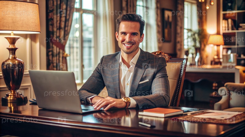 Веселый филантроп, работающий за столом в роскошном офисе