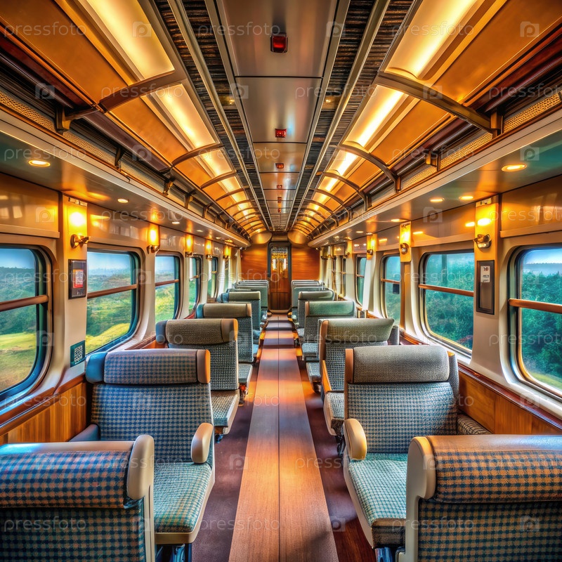 Пустой интерьер вагона поезда с видом из окна на пышный зеленый ландшафт. генеративная ИИ