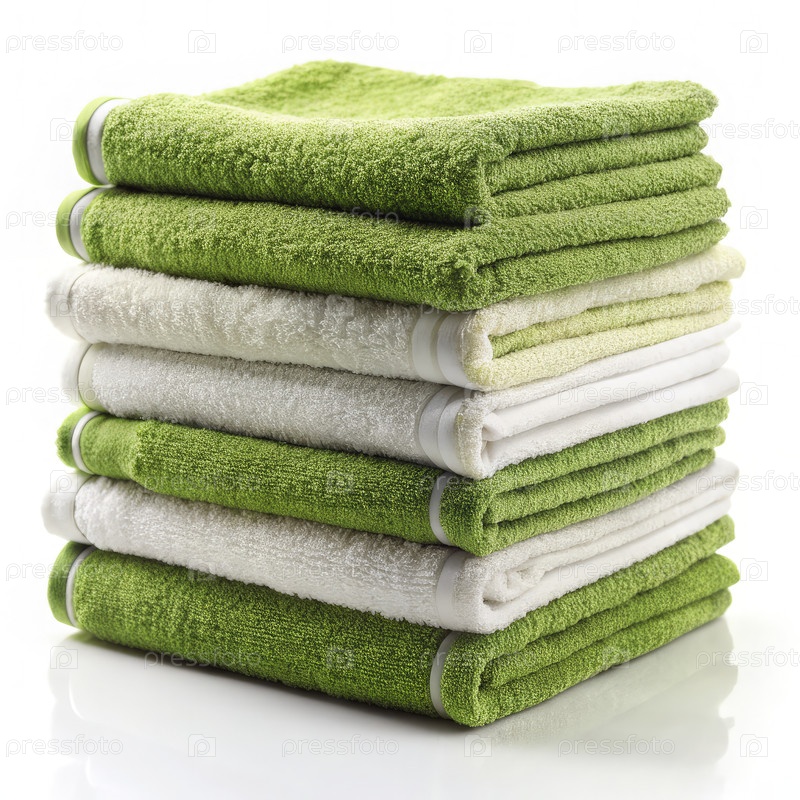 Стол свежих зеленых и белых полотенцев на белом фоне