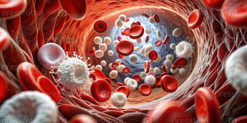 Микроскопический взгляд на красные кровяные клетки и тромбоциты, протекающие через вену