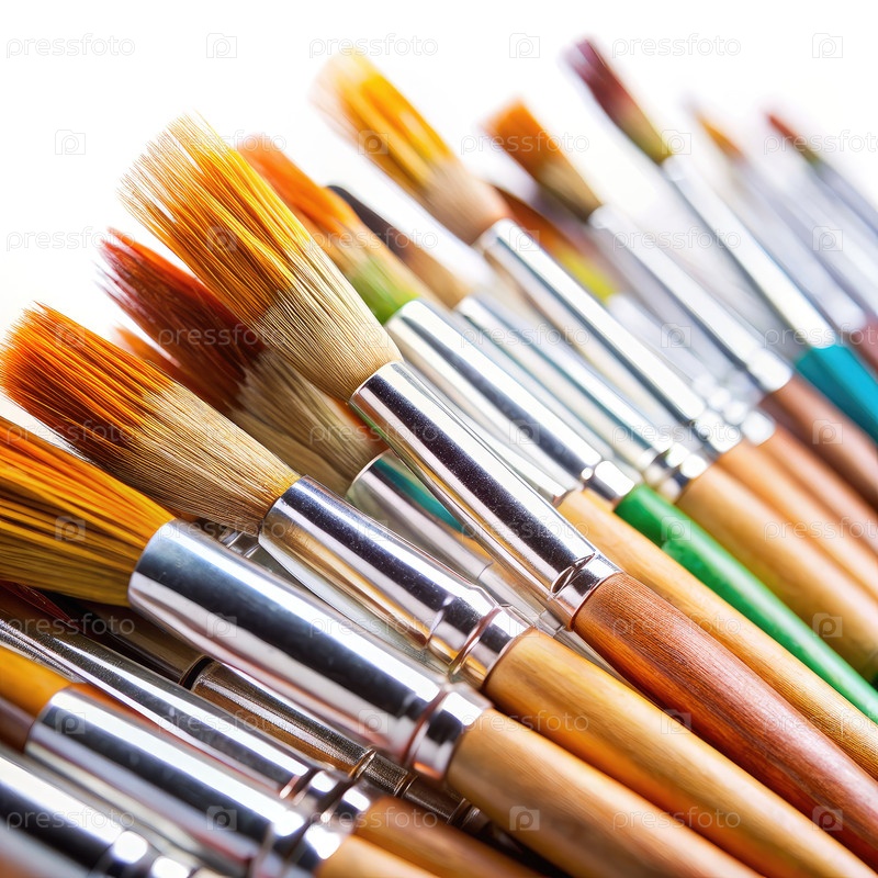 Ближайшее изображение кистей краски, расположенных на белом фоне