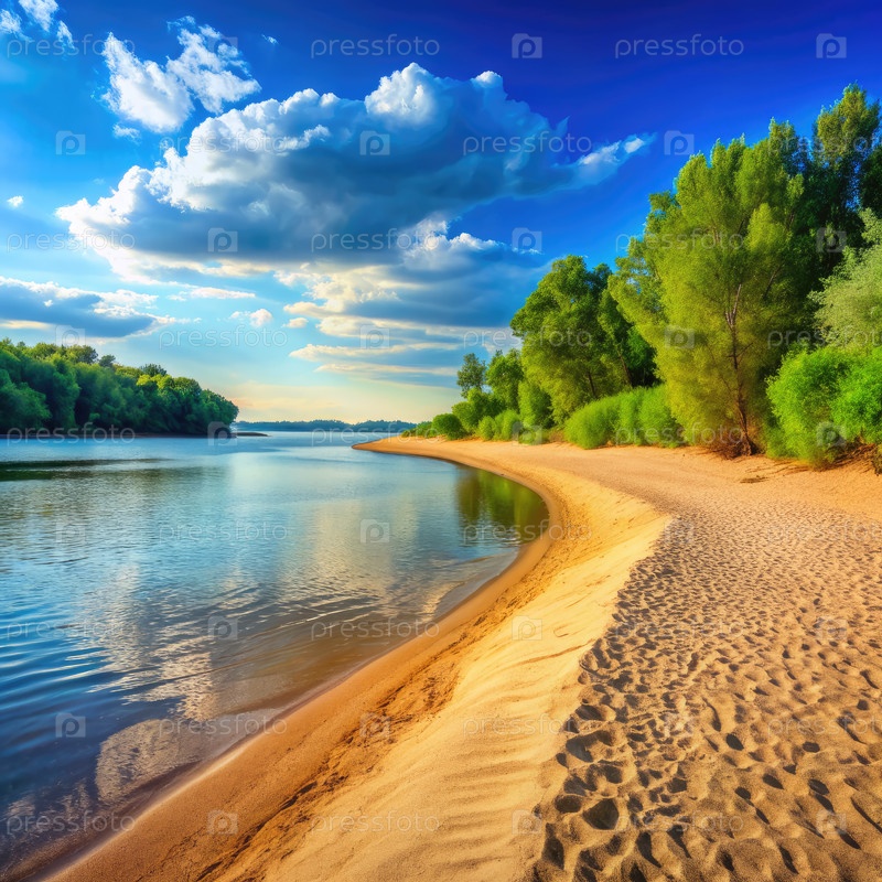 Спокойный пляж на берегу реки с пышными зелеными деревьями и голубым небом