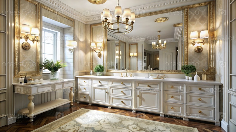Элегантная ванная комната Hollywood Regency с большим украшенным зеркалом и люстрами