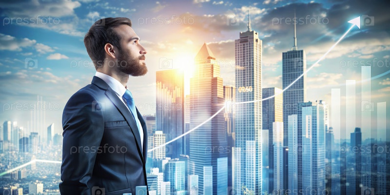 Бизнесмен, смотрящий вверх на Cityscape с линией восходящего тренда