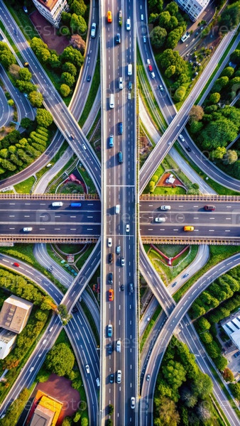 Вид с воздуха на сложное автомагистральное пересечение с движением транспорта в течение дня
