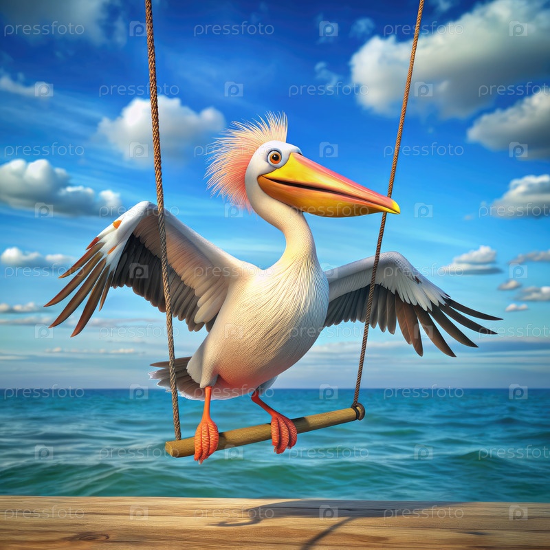 Анимационный пеликан наслаждается качелем в солнечный день у океана