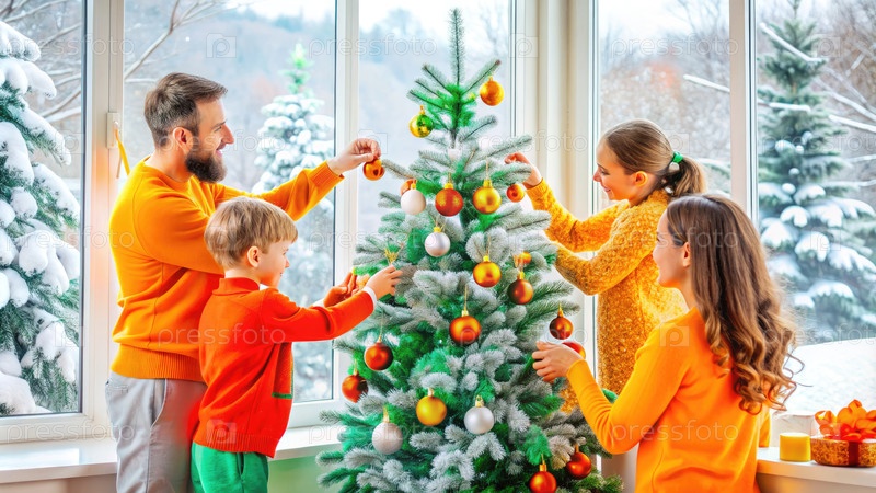Семья украшает свою рождественскую елку рядом со снежным окном