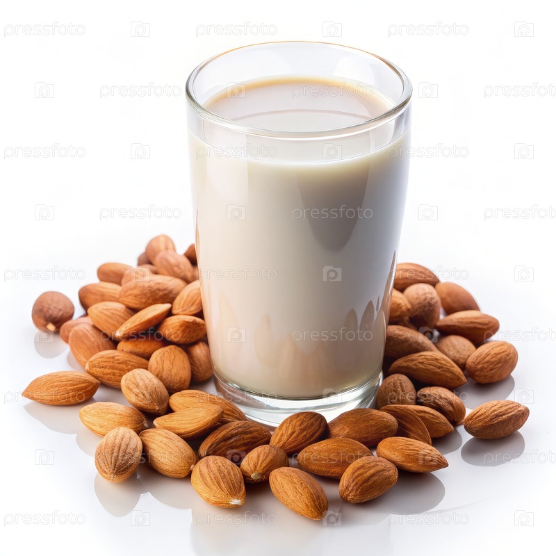 Стакан миндального молока, окруженный миндалями на белом фоне