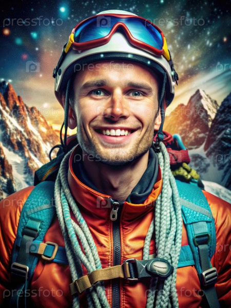 Счастливый альпинист с рюкзаком и веревкой в снежных горах