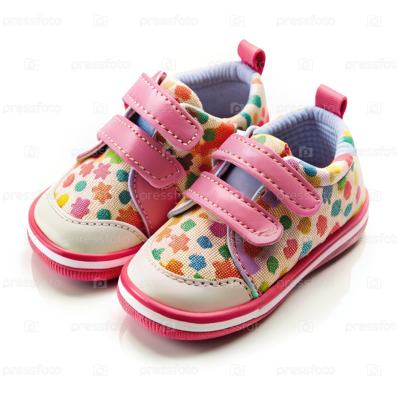 Красочные туфли для малышей с розовыми ремнями и белыми подошвами на белом фоне