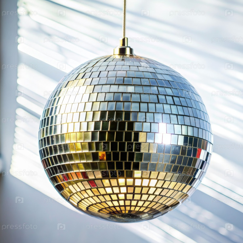 Блестящий диско-балл, висящий с потолка в комнате с белым жалюзи