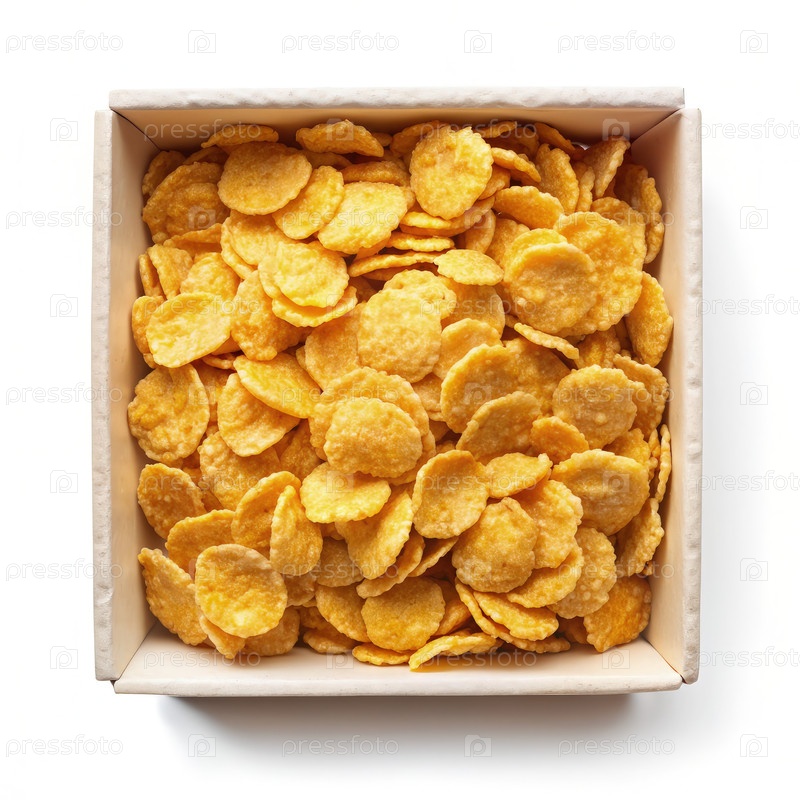 Вид сверху на квадратную коробку, заполненную золотыми кукурузными хлопьями