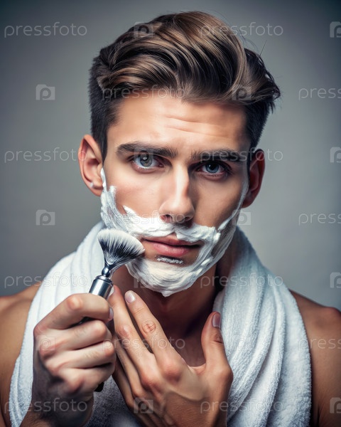Красивый мужчина наносит бритвенный крем с помощью кисти перед тем, как побриться