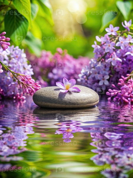 Одинокий лиловый цветок, отдыхающий на камне в тихом пруду