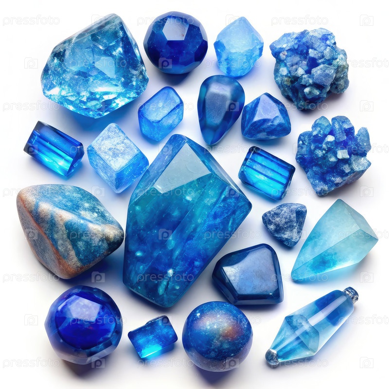 Коллекция голубых натуральных кристаллических стеклянных камней на белом фоне