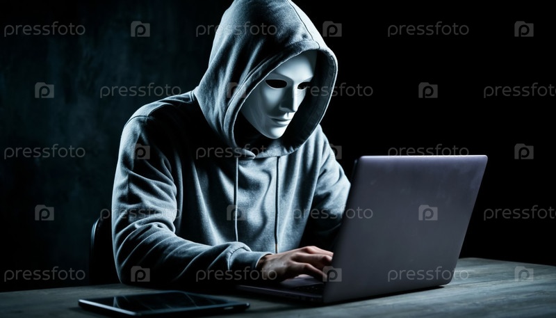 Темная комната с фигурой в капюшоне на ноутбуке, представляющей киберугрозы и взлом