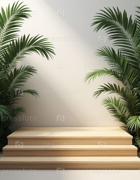 Natural Wood Display Stand с листьями тропических пальм для демонстрации продукта