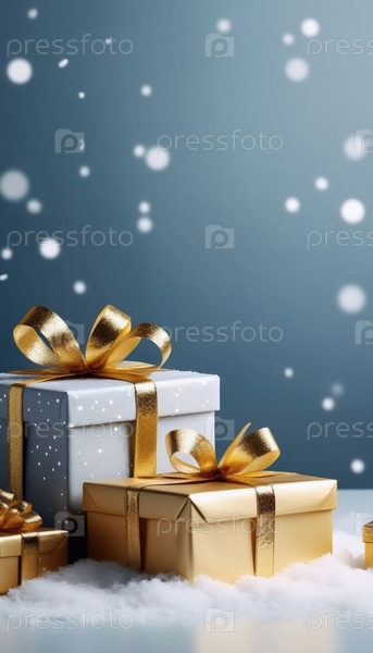 Рождественские подарки в золотых коробках на голубом снежном фоне