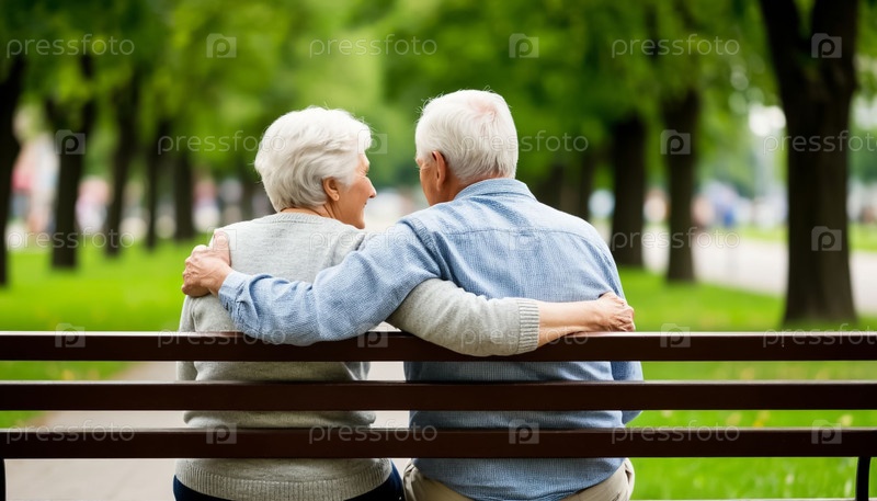 Пожилая пара сидит на скамейке в парке, обнимаясь сзади