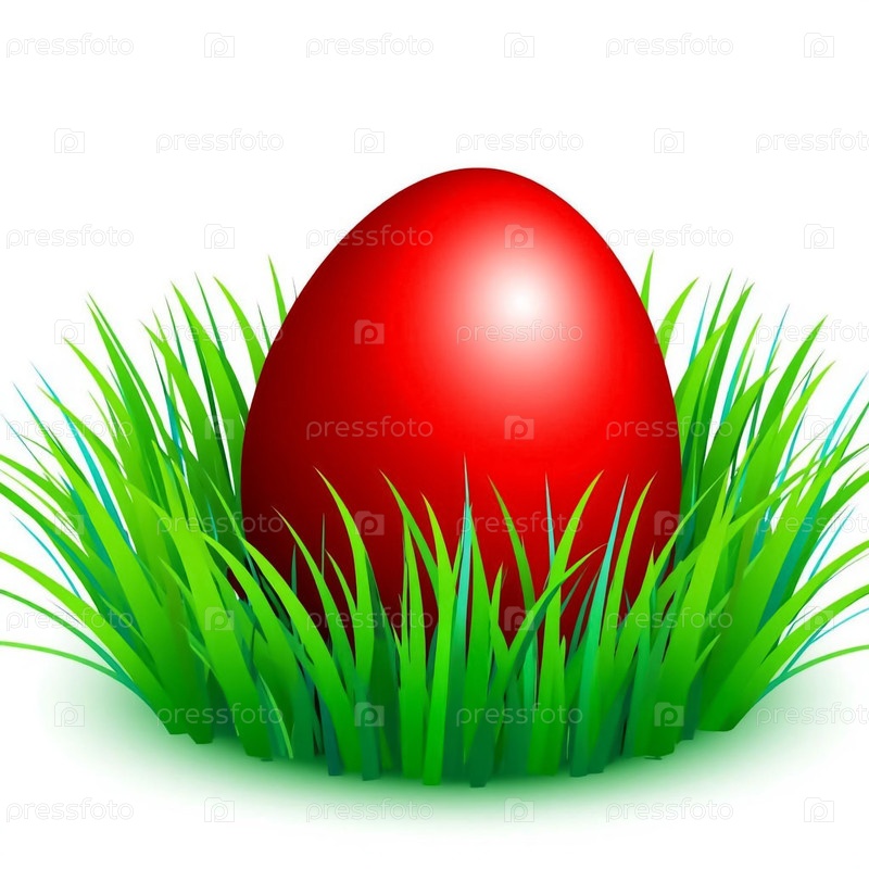 Красное пасхальное яйцо в зеленой траве на чистом белом фоне, минималистическая весенняя концепция