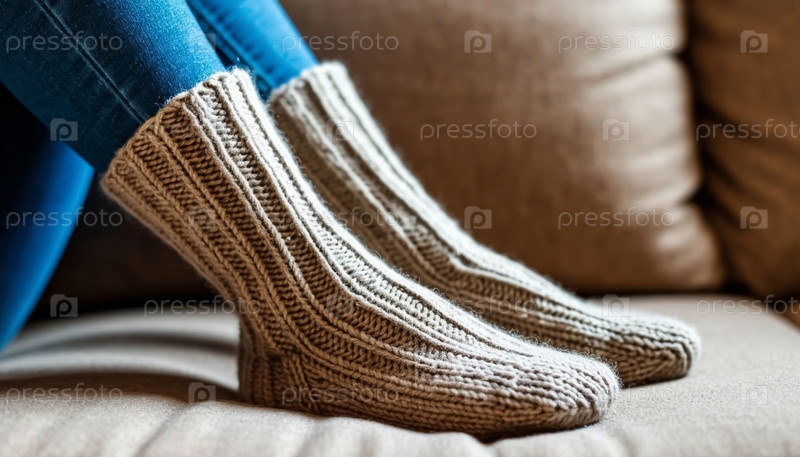 Расслабленные ноги в теплых шерстяных вязаных носках из мягкой пряжи на диване