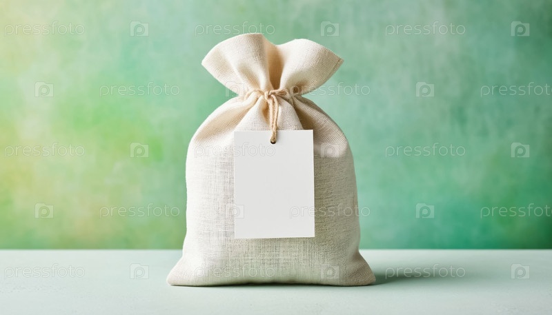 Белый экологически чистый льняной пакет с пустой меткой на зеленом фонде