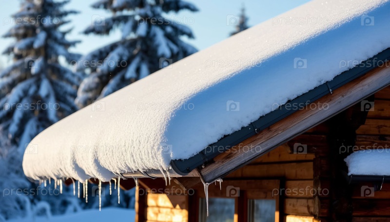 Густой снег на крыше дома в солнечную зимнюю погоду