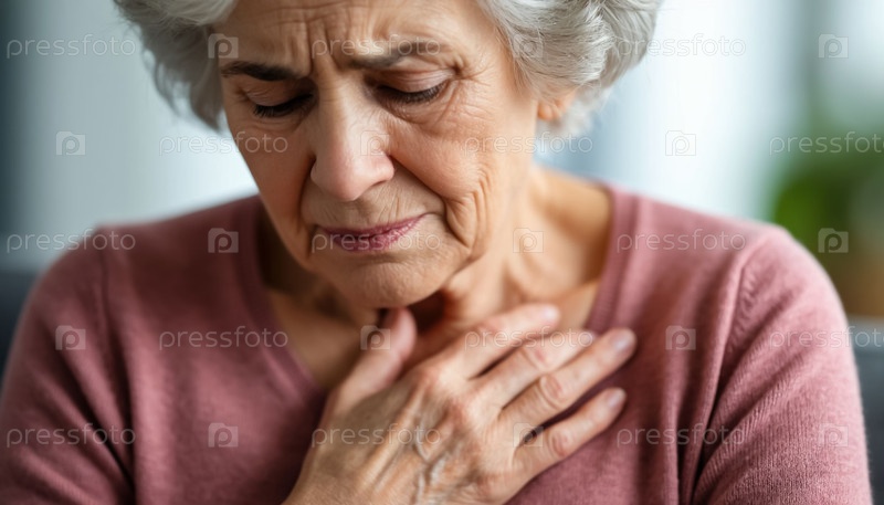 Пожилая женщина, держащая грудь в дискомфорте изблизи - проблемы с сердцем