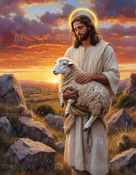 Иисус Христос как Пастырь, держащий овец среди скал и шипов