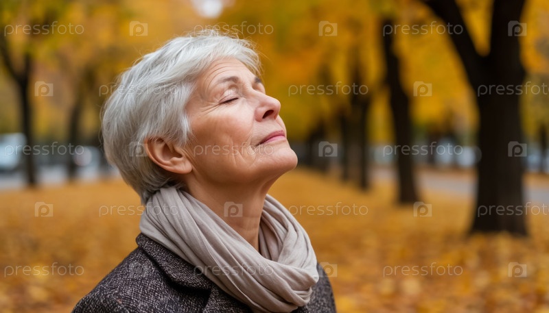 Пожилая женщина наслаждается свежим воздухом в Осеннем парке Спокойная сцена