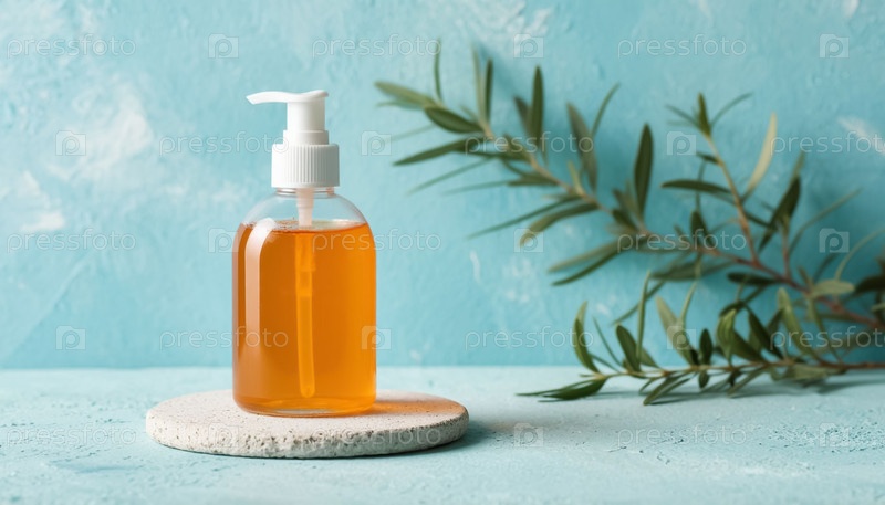 Оранжевый косметический гель в бутылке с насосом на синем фоне, макеты продуктов по уходу за кожей