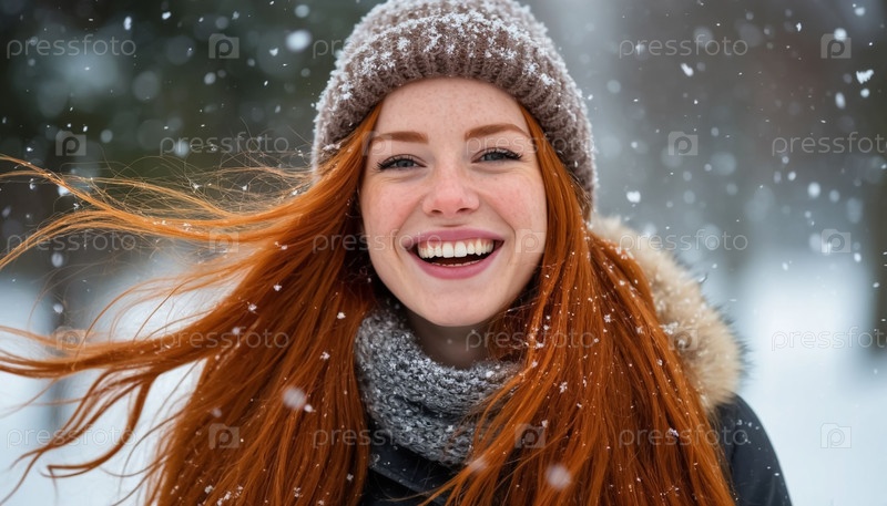 Счастливая рыжеволосая девушка смеется в зимней шляпе Портрет ИИ Красочная страница