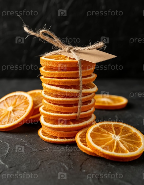Сушеные нарезы апельсина с твином и пустым тегом на темном фоне