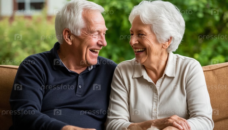 Счастливая пара пенсионеров сидит рядом и смеется