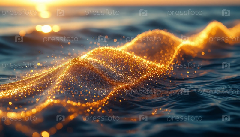 Золотой боке фон с искрящейся пылью и текущими голубыми световыми волнами