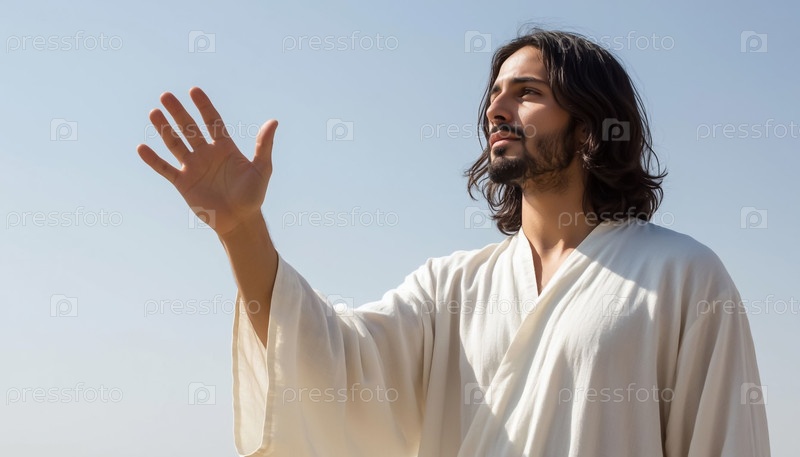 Иисус Христос на голубом небе Фон Достижение руки вверх и вперед Божественный жест