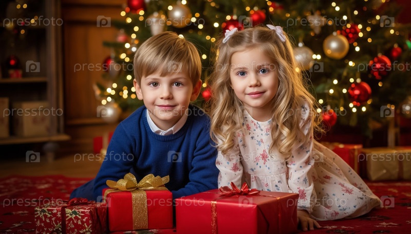 Молодые дети разворачивают праздничные подарки Портрет