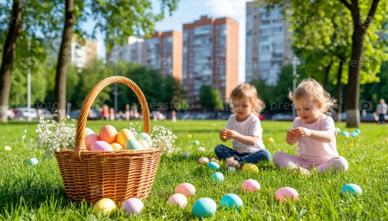 Солнечное празднование Пасхи с пастельной корзиной яиц и детьми, играющими на траве